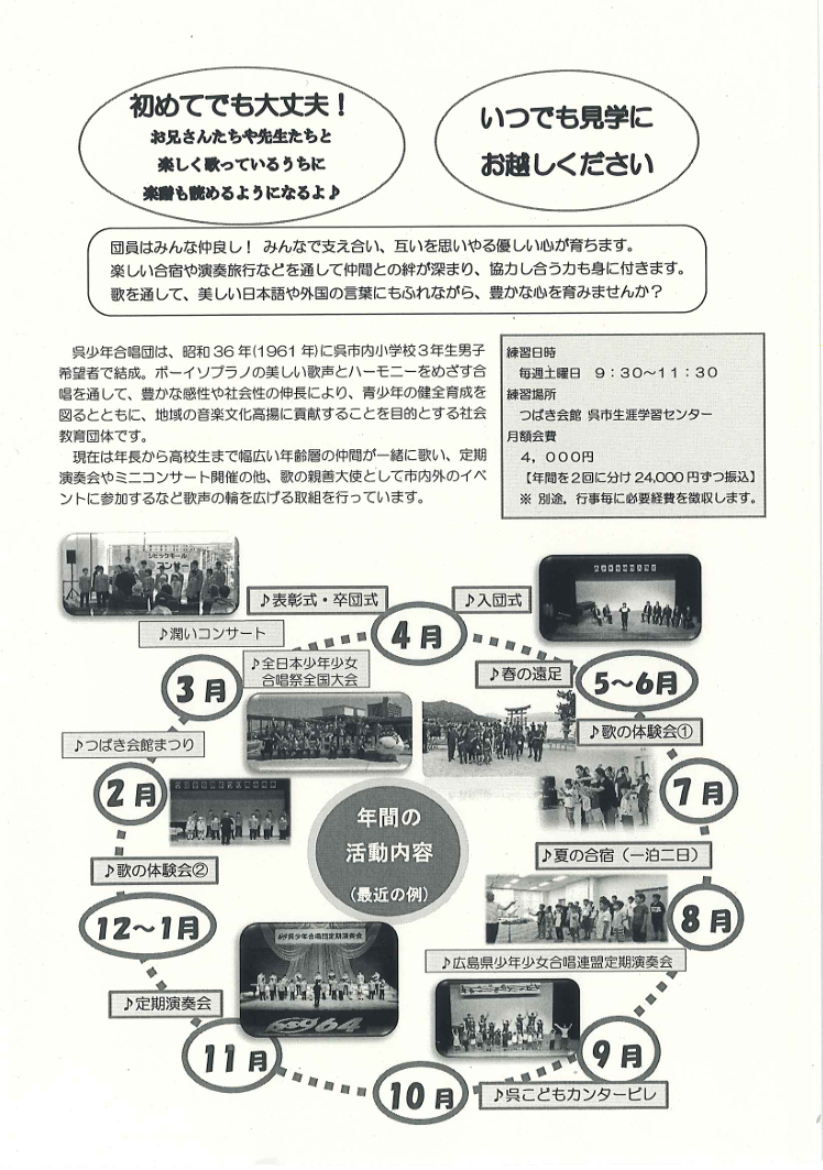 呉少年合唱団は、青少年の健全育成を目指し、子どもたちの音楽性の向上および地域社会の音楽文化の高揚を目的としている社会教育団体です。指導者、OB、保護者の方々、合唱団を応援してくださっている方など、さまざまな人たちに支えられて運営されています。団員の成長は もちろん、保護者の方にとっても他では体験できない経験を得ることができます。呉少年合唱団の仲間になりませんか?